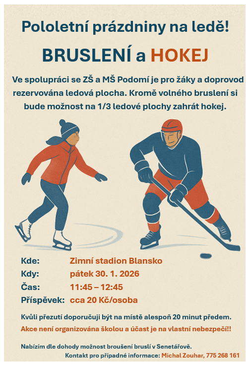 Ve spolupráci se ZŠ Podomí je na pátek 30. 1. 2026 od 12:45 - 13:45 rezervována ledová plocha na Zimním stadionu v Blansku. Bude možnost bruslit dle libosti a na 1/3 ledové plochy si vzít hokejky a zahrát si „hokej“. Příspěvek bude stanoven na místě, odhaduji cca 20 Kč/osoba. Kvůli přezutí doporučuji být na zimním stadionu alespoň 20 minut předem. Pro více informací a případně pro nabroušení bruslí mě kontaktujte. Michal Zouhar, 775 268 161.