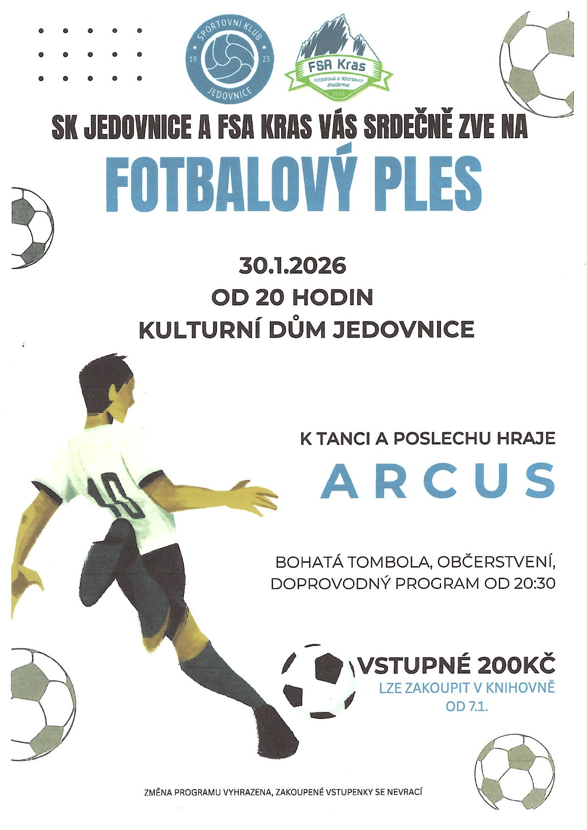 V pátek 30.01.2026 se v prostorách KD Jedovnice uskuteční Fotbalový ples. Začátek od 20:00 hodin. Hraje skupina Arcus. Od 20:30 hod. připraven doprovodný program, občerstvení, bohatá tombola.