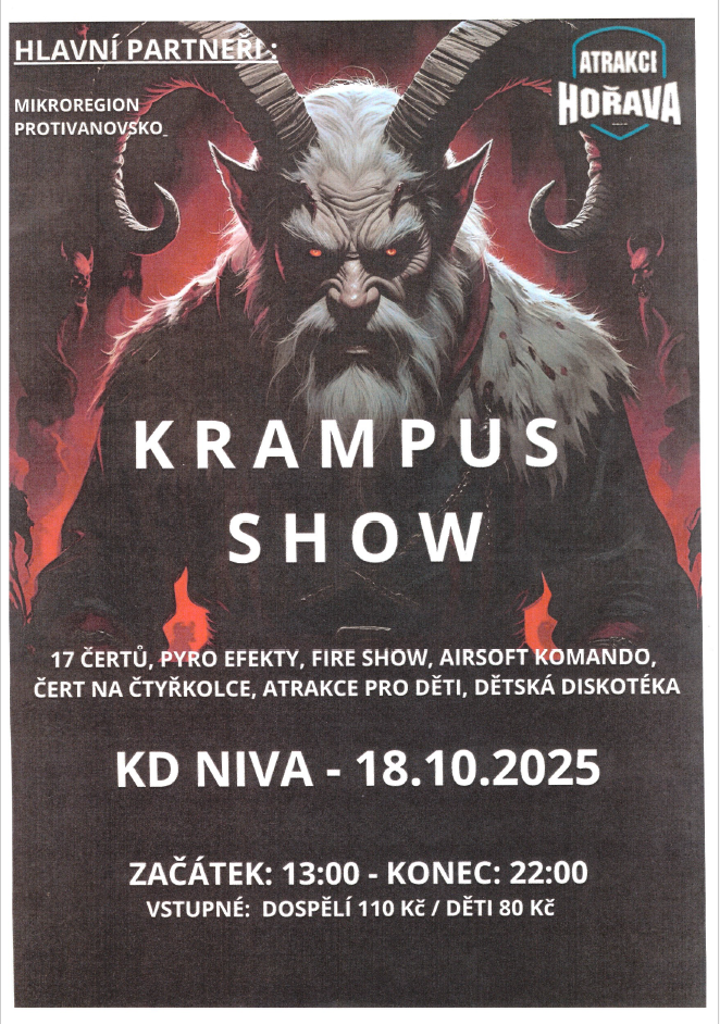 Mikroregion Protivanovsko Vás zve na Krampus show, která se koná v sobotu 18.10.2025 v kulturním domě na Nivě. Začátek ve 13:00 hodin. Připraveny jsou atrakce pro děti, dětská diskotéka...