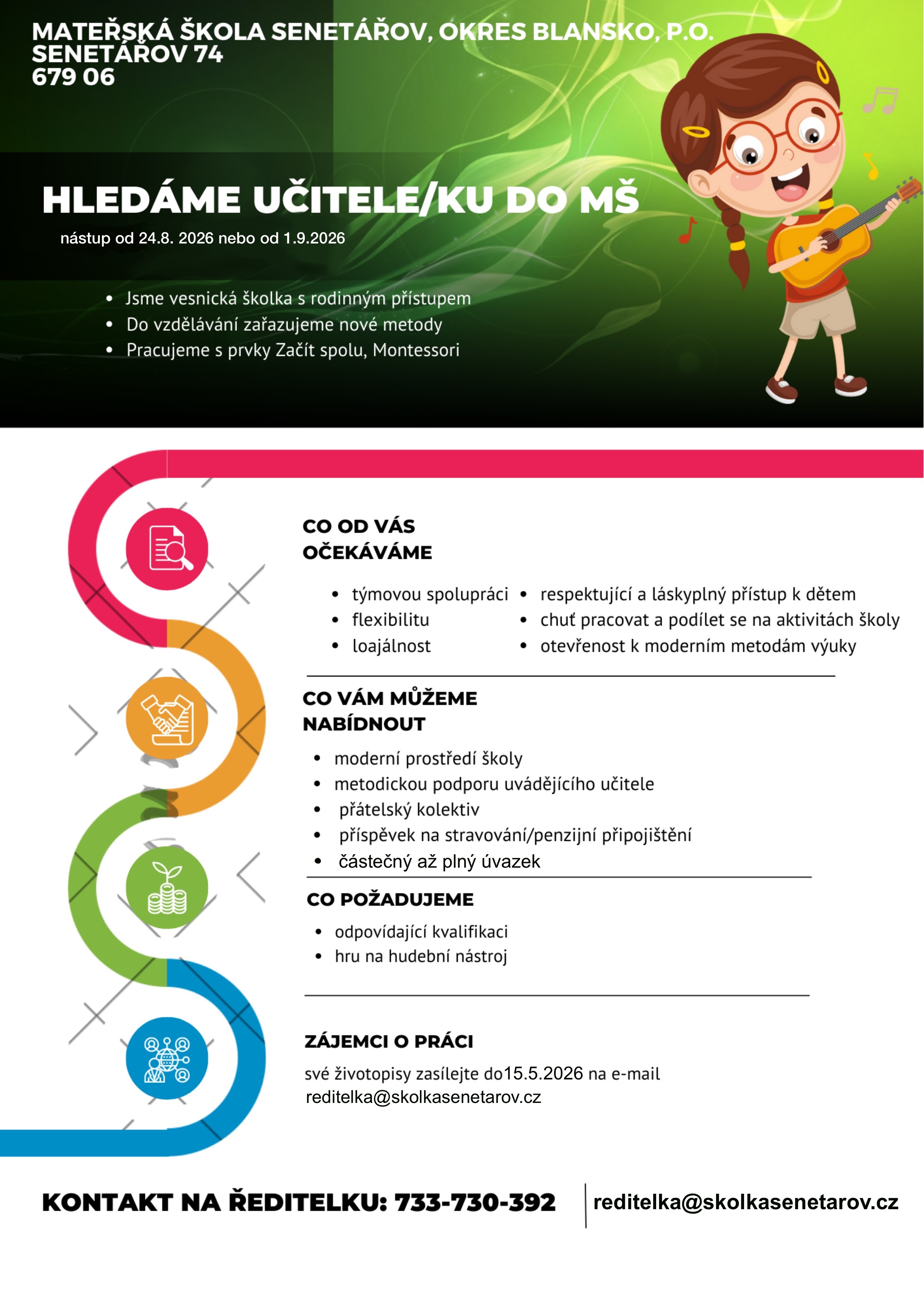 Mateřská škola Senetářov hledá učitele/ku. Nástup od 24.08.2026 popřípadě 01.09.2026. Zájemci mohou zaslat životopis do 15.05.2026 na e-mail: reditelka@skolkasenetarov.cz. Bližší informace na tel.č. 733 730 392 nebo na e-mailu reditelka@skolkasenetarov.cz.