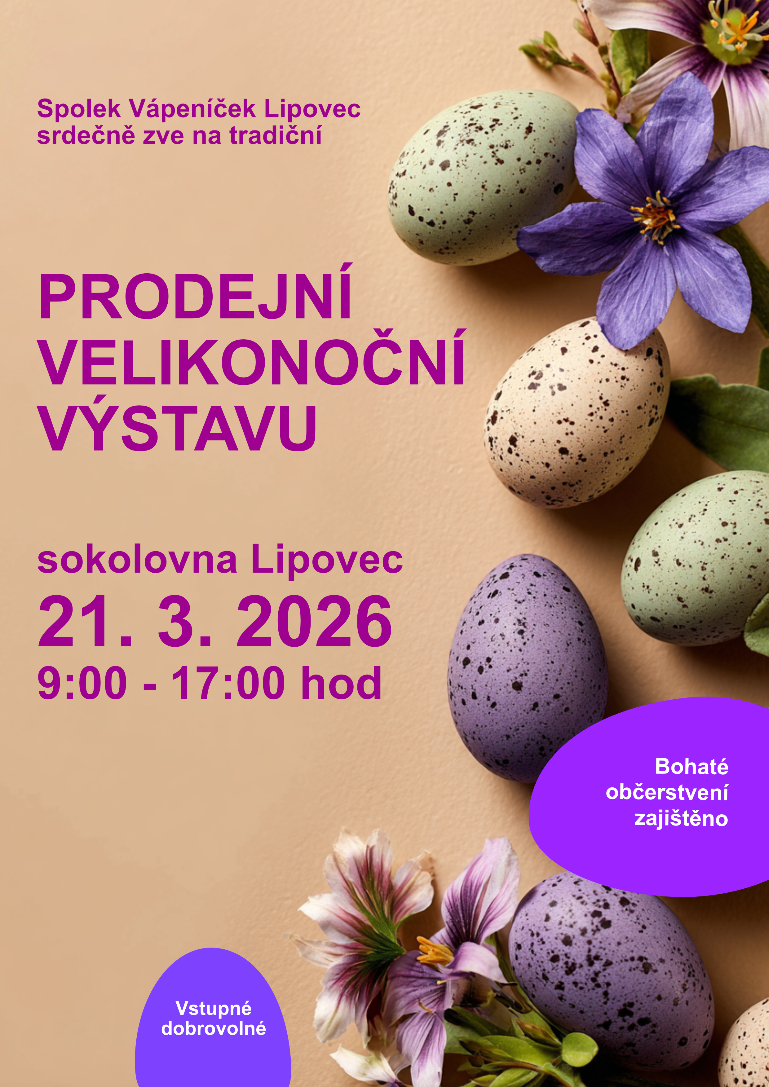 Spolek Vápeníček Vás zve na prodejní velikonoční výstavu, které se koná v sobotu 21. března 2026 v době od 09:00 do 17:00 hodin v sokolovně v Lipovci.