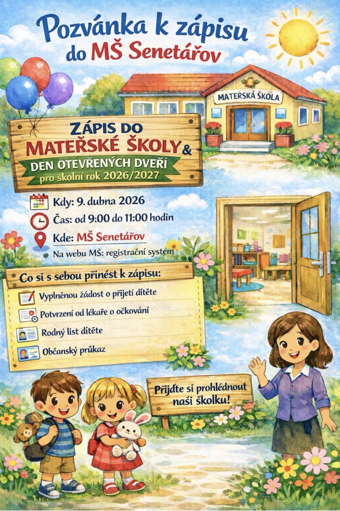 Zápis dětí do mateřské školy Senetářov se koná ve čtvrtek 9. dubna 2026 v době od 09:00 do 11:00 hodin v budově MŠ Senetářov.